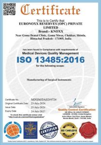 Knoxx Surgicals, an ISO 13485:2016 certified company, is committed to creating superior surgical instruments trusted by medical professionals worldwide. With a heritage in precision engineering and a focus on innovation, we produce millions of instruments annually, sourced from quality materials, including German Tekno forgings. Our dedication to quality is reflected in every instrument, backed by a lifetime guarantee.